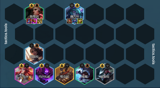 阵容组成:崔斯特、斯维因、泰隆、薇古丝、马尔扎蛤、拉克丝、莎弥拉、维克托