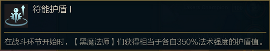 这套阵容对于海克斯强化的要求还是非常高的。最佳的选择搭配就是符能护盾。效果果能够提升自身的300%/450%/600%法术强度的护盾值。这是对于黑魔法师最大的提升,能够让所有黑魔法师有足够的护盾加成和容错率。特别是黑魔乌鸦,这是护盾的主要来源。