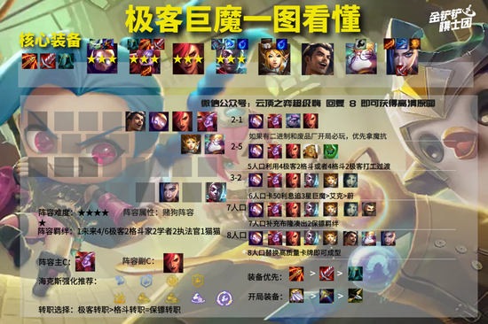 极客巨魔是一套以巨魔为核心的赌狗阵容。这套阵容强势点在于2星即可发力,适合当前版本快节奏的环境。阵容核心就是4极客羁绊,极客棋子只要有一个散件就可以随机合成一个成品装备,而新版本二进制羁绊的改动使得搭配极客羁绊变得超级无敌的强。