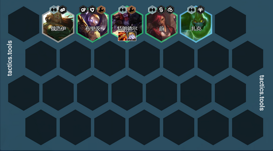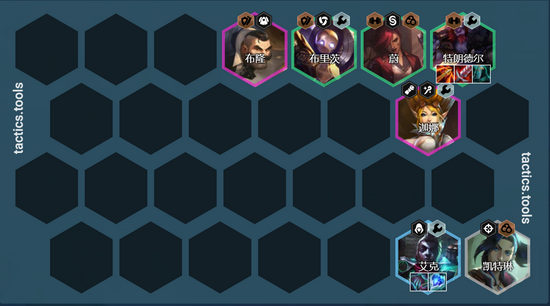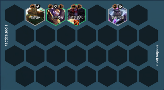 6人口凑出4极客2格斗家2执法官阵容,卡50利息追3星巨魔>蔚=艾克>机器,如果没有迦娜就用EZ或者炸弹来代替,谁先2星就用谁来打工,这两个英雄强度都非常一般挂件而已。