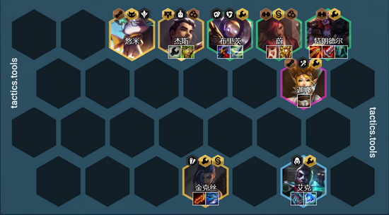 阵容组成:巨魔、蔚 、风女、艾克、金克斯、杰斯、猫咪+机器(6基克)/布隆(2保镖)/蒙多(4格斗)