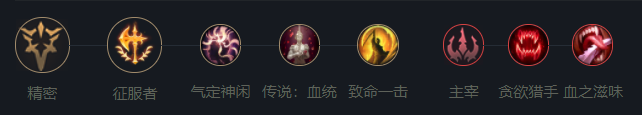 莎弥拉符文选择征服者,这依旧是目前最为契合莎弥拉的符文,因为莎弥拉不吃攻速,只需要攻击力和吸血能力即可。下面点出凯旋,因为大招不需要蓝耗,凯旋对于残血收割会更好用。下面点出血统增加吸血能力,最后一行点出致命一击增加斩杀能力。副系选择主宰的双吸血增加对线回复一级后期全能吸血。