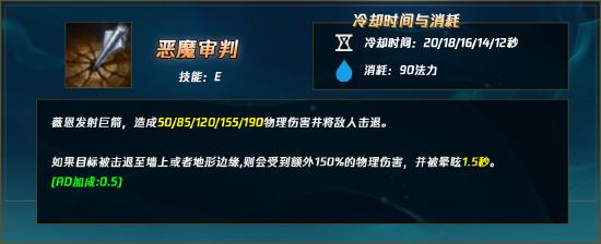 1V1或2V2时,E技能的上限非常高,推到墙上长达1.5秒的晕眩, 前期能打出一个Aq,中后期至少能打出一个三环,是上限非常高的反杀神技。