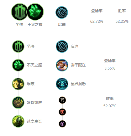 奥恩作为坦克英雄,符文上首选坚决。不灭之握可以增加奥恩的血量,同时在对线上还可以找机会进行消耗。爆破可以帮助奥恩快速推塔。骸骨镀层则是让奥恩在面对战士上单消耗的时候,进行一个防御。过度生长则是一个残血的快速回复,增加赖线发育时间。