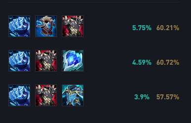 石头人首选霜火护手,这件装备的神话被动会增加提醒与被动,同时被动还可以造成减速,石头人只有大招一个控制,其他技能都是减速,有了这件装备,石头人装进去在搭配技能与装备的减速,可以轻松的让对面无法移动。第二件装备可以选择反伤甲,有了反甲就可以不用出减治疗。第三件装备则可以根据情况来选择,如果对面AP伤害较高,可以选择自然之力,如果是AD较多或者伤害高,可以选择冰心。
