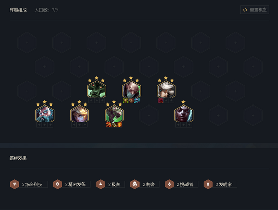 4-5升7人口组成完整阵容3炼金3发明家2精密发条2刺客2极客2挑战者