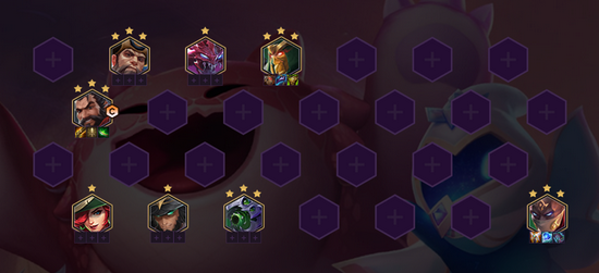 因为我们的主要目的是为了在打石头人之后有大量的金币抽出三星无畏重炮,让无畏重炮带上剑转火炮。3-2阶段才是阵容发力的阶段,3-2我们上无畏重炮+海上幽影+地火霸主+虚空重炮+御界守组成3豪侠3剑士3枪手阵容。
