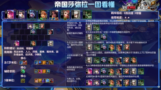大家切记莎弥拉D卡的节奏是和以往不同的,我们要在6人口去D,虽然6人口的概率和7人口相差5%但是2费卡在七人口是不好搜到三的,所以要在6人口D,追出一个或两个三星后再去考虑上人口找莎弥拉的三星,3阶段场面全部两星的3帝国4挑战以及莎弥拉有饮血和巨杀是完全能打出连胜的,所以大家无需着急上7人口,6人口的2费卡:狼人乌鸦奎因以及男刀是都推荐追三的,乌鸦三了又肉伤害又高,男刀三了可以跳对面后排稳切一个C位,奎因是必须要三星的,这套阵容中只有奎因是莎弥拉的辅助,所以一定要追,最后如果卡格子可以不考虑狼人,因为狼人三星的性价比稍低。