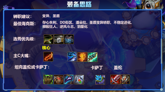 装备来讲主要核心的就是羊刀,其他的主要优先反甲狂徒,这样可以根据胡卡萨丁还是胡德玛来选择给谁装备,变化更加灵活,有圣盾转给大嘴大嘴更是打不死的存在。