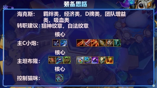 以上纹章拿到手基本要上9人口才能开出大羁绊,或者在8人口去掉低质量卡来补足羁绊,所以说这套阵容对转职基本是没有要求的,毕竟在现在这种3主打3阶段的环境,上9人口基本是不可能的事情,所以大家海克斯尽量不要想着拿文章之书。