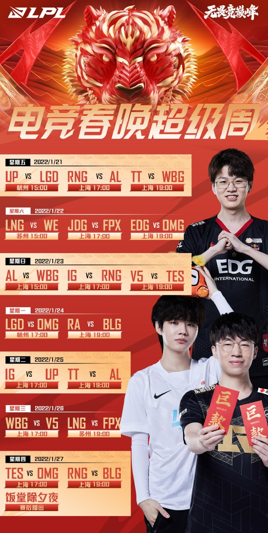 虎年春节将至,2022 英雄联盟职业联赛(LPL)春季赛常规赛将在1月21日-1月27日期间开启“电竞春晚超级周”,邀请召唤师们共同见证农历新年前的最后一个赛事周的对决!届时LPL将不仅有RNG vs BLG、LNG vs FPX、EDG vs OMG等十余场精彩赛事陆续奉上,同时还会带来三大主题活动、百万红包封面福利,以及特别节目《饭堂除夕夜》,为各位送上召唤师峡谷里的年夜大餐!