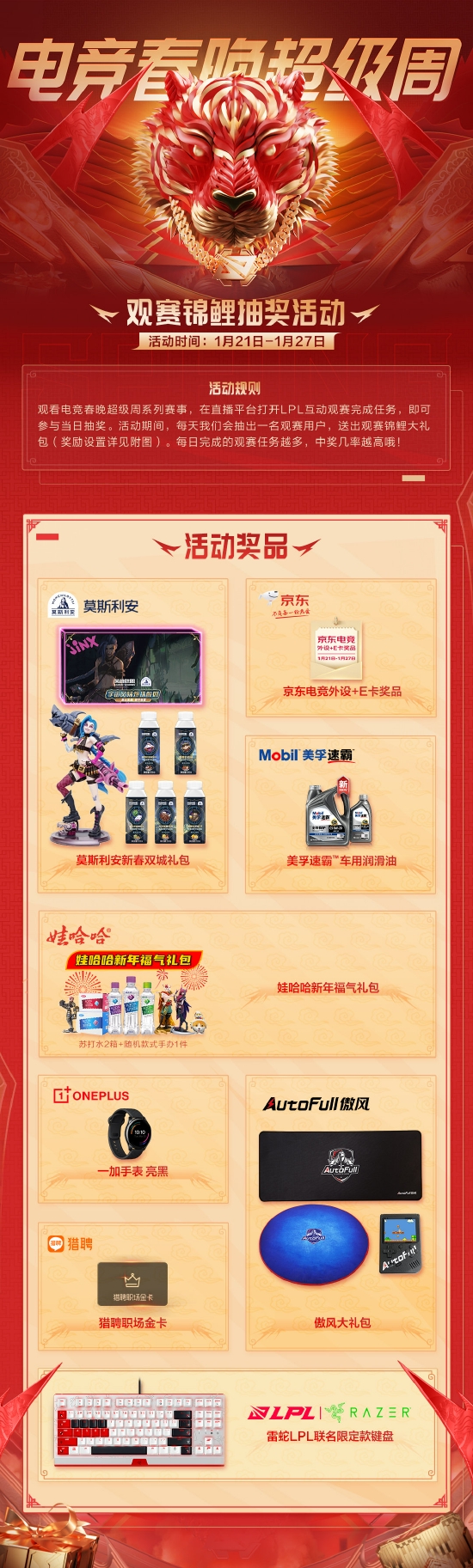 不仅如此,“电竞春晚超级周”期间完成LPL互动观赛系统上的观赛任务,即可参与当日的“观赛锦鲤抽奖”活动。届时将每天抽取一名幸运观众,送出观赛锦鲤大礼包。观赛任务完成越多,中奖几率越高!
