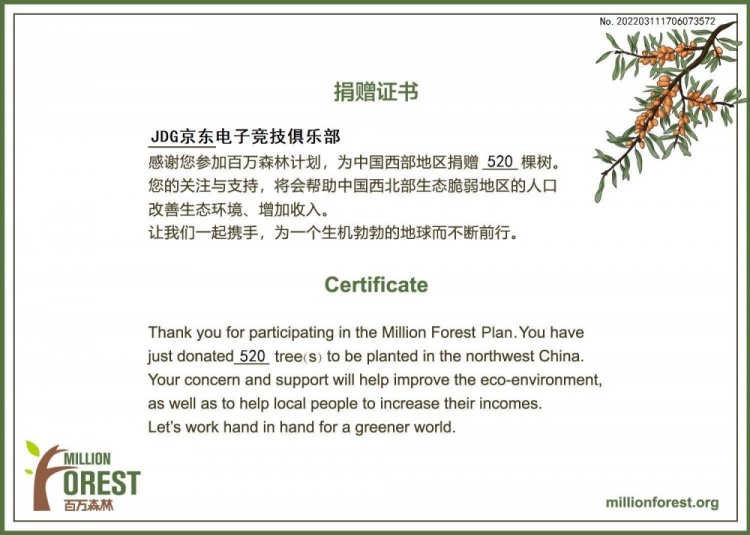 百万森林计划于2009年8月由中国绿化基金会 、气候组织、联合国环境署共同发起,我们以JDG京东电子竞技俱乐部的名义向沙漠锁边生态林-甘肃项目捐赠了520棵树,为帮助气候贫困地区人口改善生态环境贡献一份力量,同时也呼吁大家一同参与到绿化行动中来,凝聚爱心,实现自然生态体系良性循环。