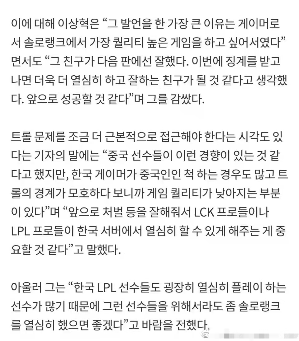 Faker因此也做出了回应,Faker说道:会那样发言的最大原因是我作为职业选手想在排位中完成最高水准的比赛。那位朋友在那局游戏之后的下一局里打得很不错,我相信他经过这次处罚之后会变得更认真更加优秀,以后也会成功的。虽然我曾经说过一些中国选手可能有这样的倾向,但是韩国玩家装作中国人的情况也很多,评判消极游戏的界限比较模糊,导致游戏水准下降。