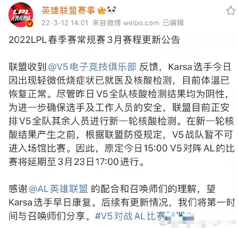 V5昨日发文说道:Karsa选手目前已及时就医并进行核酸检测,在核酸检测结果出来之前会短暂隔离,我们也将全力保障所有选手与随队人员的防疫安全及俱乐部全面消毒等措施。联盟赛事官方也说道:Karsa选手今日因出现轻微低烧症状已就医及核酸检测,目前体温已恢复正常。因此,原定今日15:00 V5对阵AL的比赛将延期至3月23日17:00进行。