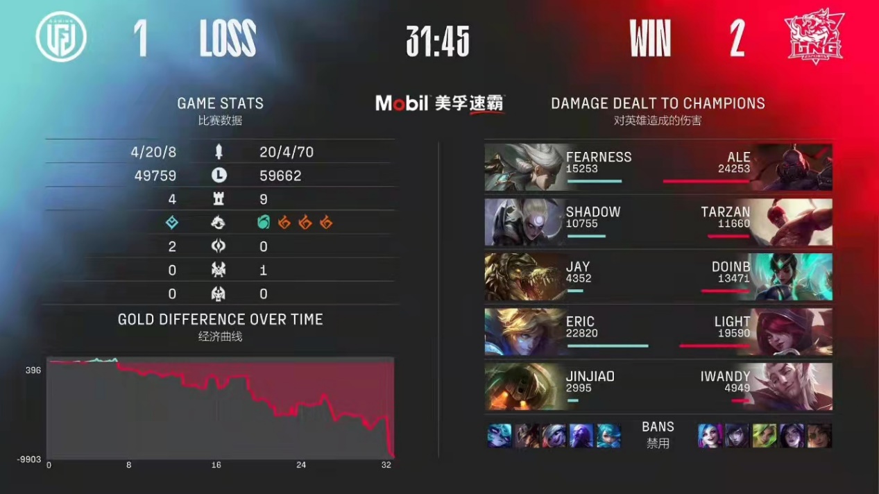 LNG对LGD,LNG很需要一场胜利来挽回状态,在先被LGD拿下首局的情况下,LNG稳住局势拿下最后胜利。