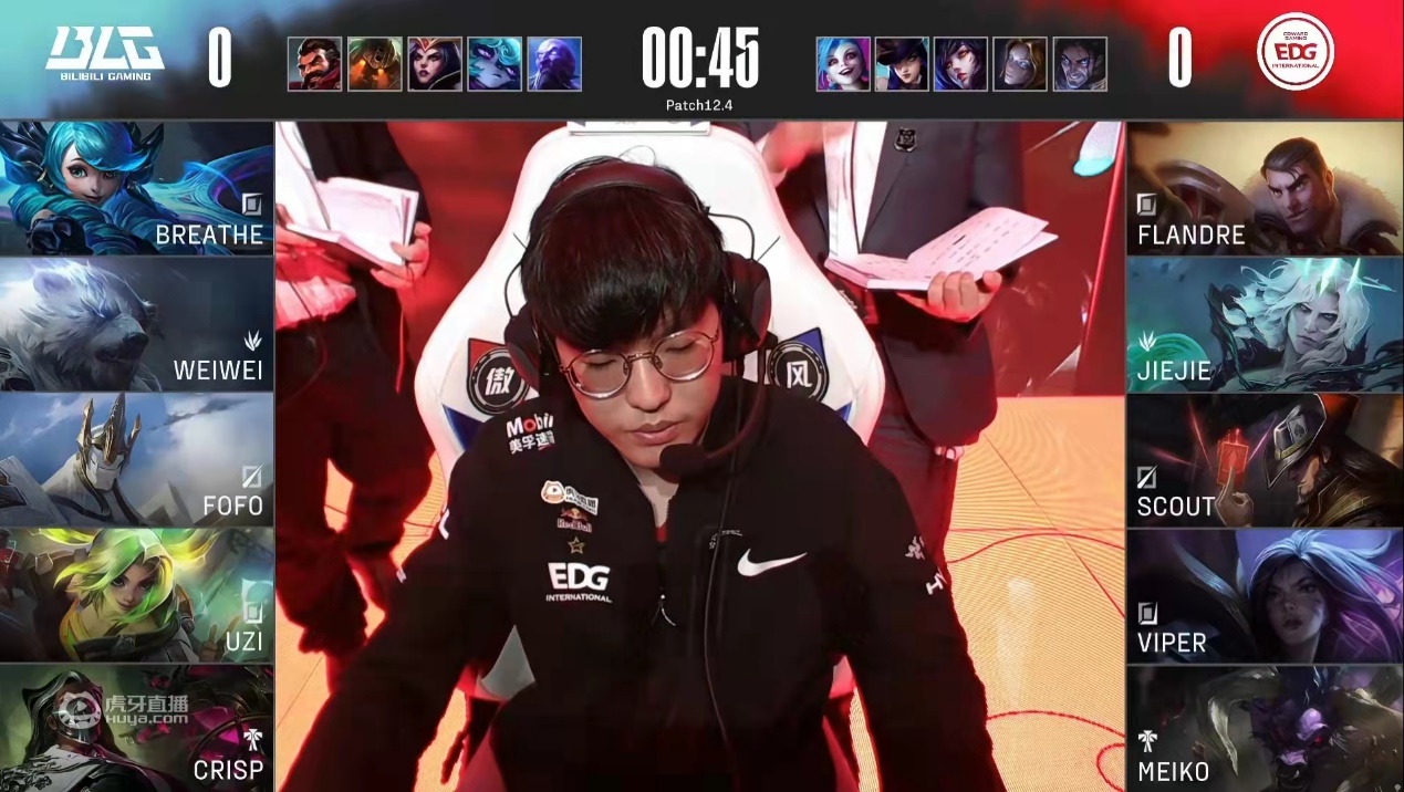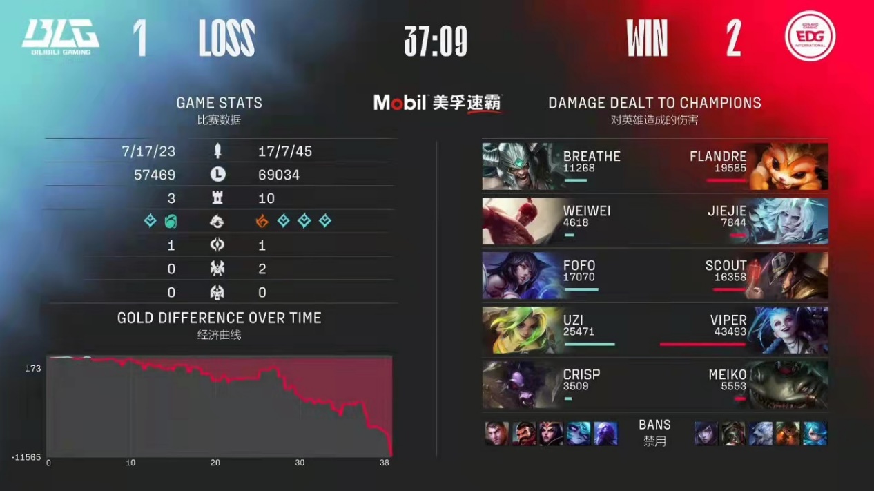 第一局,前期EDG打野佛耶戈Gank上路,但杰斯扛塔过多,格温先拿一血自己也被换掉。随后BLG打野狗熊带起节奏,EDG陷入被动,BLG拿到听牌龙。慢慢BLG拿到龙魂,找到机会击杀三杀,BLG回城补满状态拿下首局。