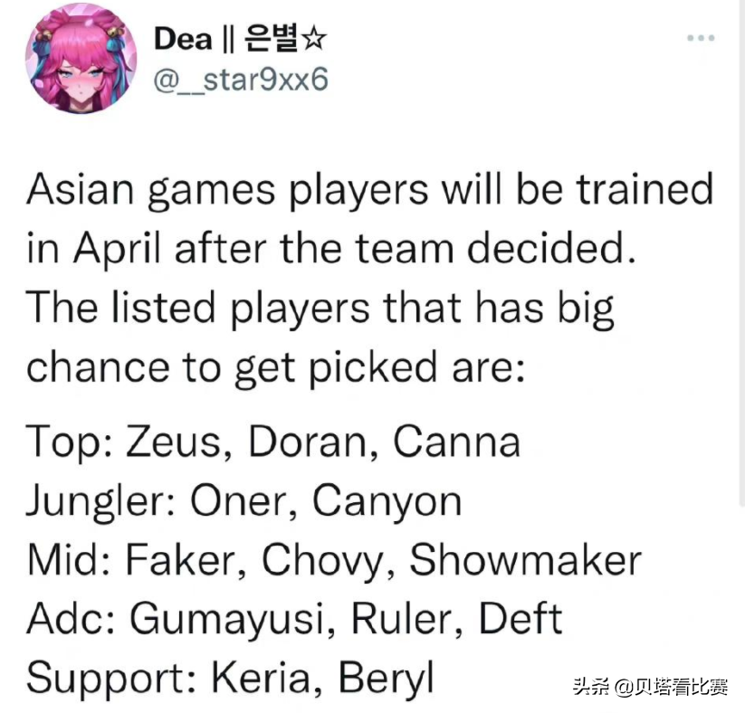 具体爆料消息如下,表示4月份即将展开亚运会的集训,目前第一轮的名单是上单zeus、Doran和canna,打野Oner和canyon,中单Faker、chovy和showmaker,AD是Gumayusi、Ruler和Deft,辅助是Keria和Beryl。