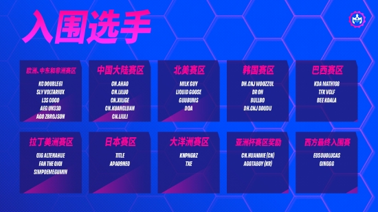 通过入围赛选拔的 32 名来自全球各个赛区的顶尖选手将向 30 万美元的丰厚奖金和《云顶之弈:双城之战》全球总冠军桂冠发起冲击!以下是入围选手名单: