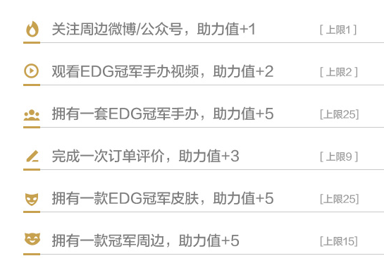 [助力值说明]通过不同方式获得的助力值,均可同时用于兑换冠军手办优惠券和为EDG助力。(获取助力值方式具体请参考活动页面详情说明)