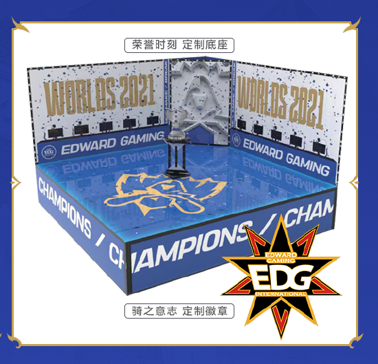2021年11月7日,EDG为LPL赛区带来久违的第三冠,感动了无数坚守的召唤师们。银龙重铸之日,骑士归来之时!2022年4月27日,英雄联盟官方商城正式开启“EDG冠军手办套装”预售活动,为EDG战队献唱至高荣誉赞歌!