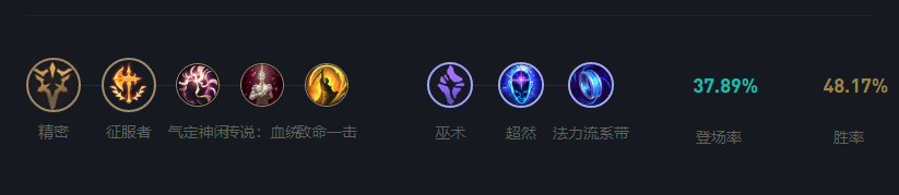 EZ符文选择征服者,EZ的Q技能就能触发叠加征服者,气定神闲搭配女神泪,增加EZ的回蓝,血统增加吸血,致命一击增加收割能力。