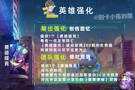 由于阵容是比较依赖高费卡来提升阵容的上限,因此英雄强化的选择中我们一般选择五费卡或者怪兽卡即可,如果都没有以上说的的英雄强化,那么我们也可以选择输出类的英雄强化,比较推荐:卡莎,伊泽瑞尔,锐雯等