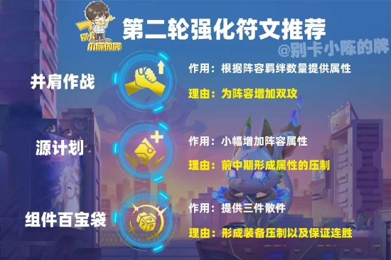 通用类的强化符文推荐大家选择提供装备类的以及增加战斗力类的,为了保证前中期的输出能力,我们一般可以选择组件百宝袋,源计划等及时提升阵容战斗力的