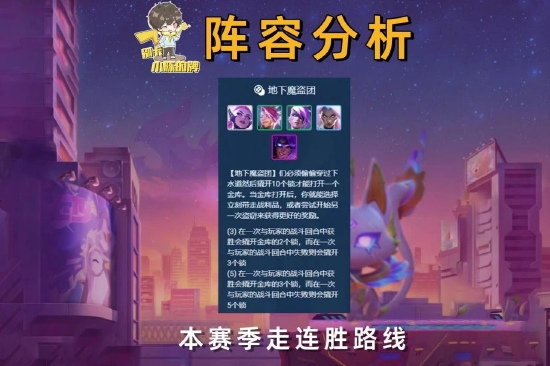 2阶段:2-1升四人口,开局有三魔盗团才选择这套阵容的运营思路,同时搭配上斗士或者决斗大师进行连胜过度,不需要考虑完美装备,魔盗团会给予惊喜