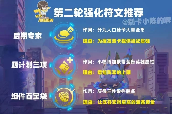 其次可以优先选择通用类的强化符文,由于阵容对于装备和经济也是比较依赖的,因此像组件百宝袋,后期专家等都是不错的选择