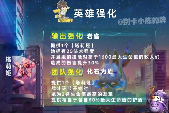 在面对英雄强化的选择中,我们的核心选择思路是增加阵容输出上限或者增加阵容坦度的,这样才可以给予让后排输出更加安稳,如果都没有的情况下也可以根据阵容中拥有的英雄进行英雄强化的选择