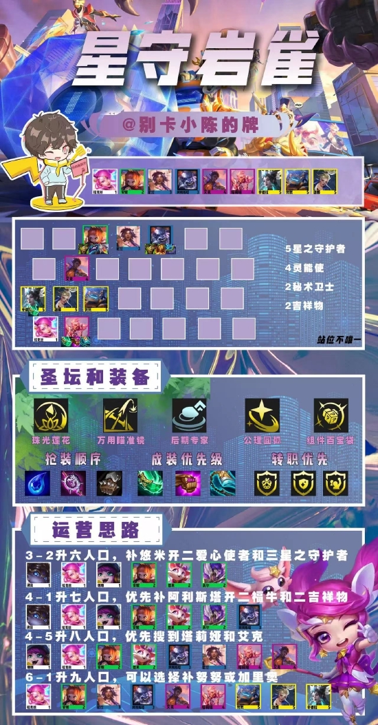3阶段:3-2升六人口,优先补悠米开二爱心使者和三星之守护者羁绊,提高拉克丝的输出效率更好的过渡上人口;