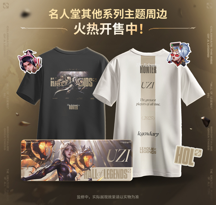 2025英雄联盟名人堂 联盟不朽卡莎 主题款T恤&鼠标垫,以及名人堂徽章套装同步上新,融入Uzi职业生涯的标志性元素,致敬传奇猎手;丰富的主题周边品类,满足粉丝对Uzi传奇生涯的情感投射!